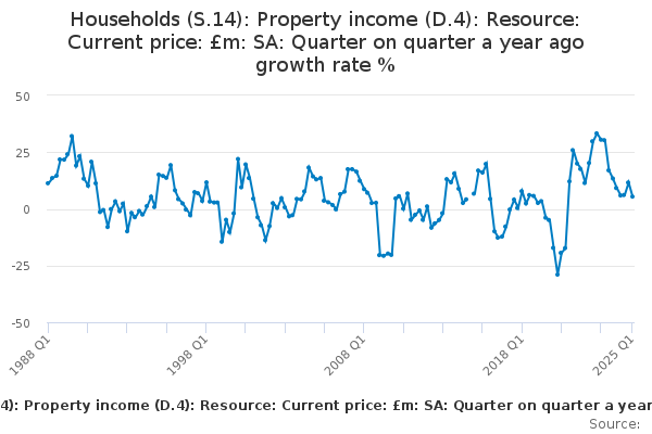 Download this time seriesHouseholds (S.14): Property income (D.4): Resource: Current price: £m: SA: Quarter on quarter a year ago growth rate %