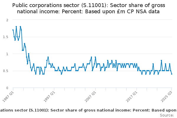 Download this time seriesPublic corporations sector (S.11001): Sector share of gross national income: Percent: Based upon £m CP NSA data