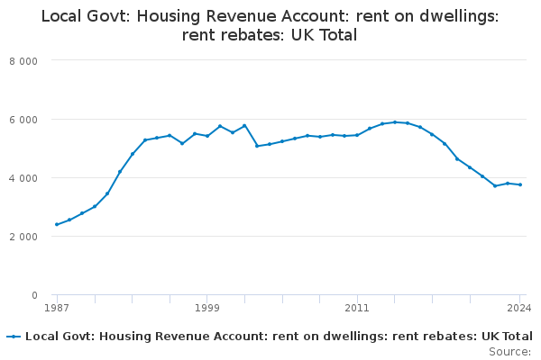 Download this time seriesLocal Govt: Housing Revenue Account: rent on dwellings: rent rebates: UK Total