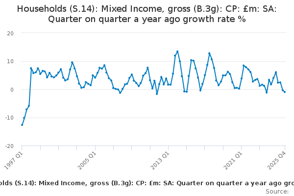 Download this time seriesHouseholds (S.14): Mixed Income, gross (B.3g): CP: £m: SA: Quarter on quarter a year ago growth rate %
