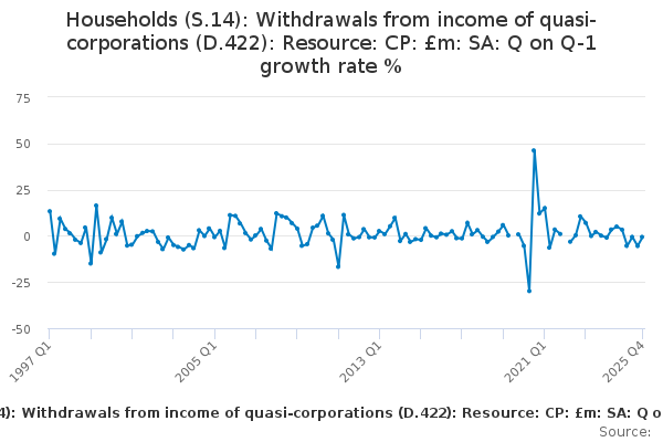 Download this time seriesHouseholds (S.14): Withdrawals from income of quasi-corporations (D.422): Resource: CP: £m: SA: Q on Q-1 growth rate %