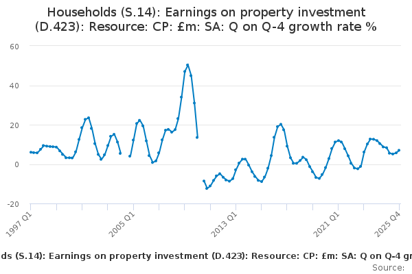 Download this time seriesHouseholds (S.14): Earnings on property investment (D.423): Resource: CP: £m: SA: Q on Q-4 growth rate %