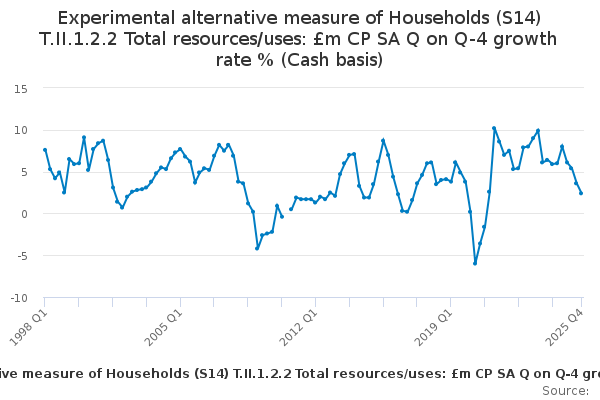 Download this time seriesExperimental alternative measure of Households (S14) T.II.1.2.2 Total resources/uses: £m CP SA Q on Q-4 growth rate % (Cash basis)