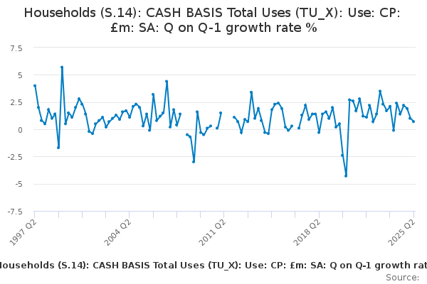 Download this time seriesHouseholds (S.14): CASH BASIS Total Uses (TU_X): Use: CP: £m: SA: Q on Q-1 growth rate %