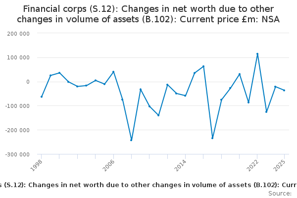Download this time seriesFinancial corps (S.12): Changes in net worth due to other changes in volume of assets (B.102): Current price £m: NSA