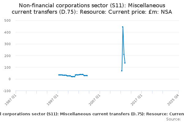 Download this time seriesNon-financial corporations sector (S11): Miscellaneous current transfers (D.75): Resource: Current price: £m: NSA