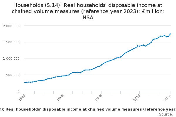 Download this time seriesHouseholds (S.14): Real households' disposable income at chained volume measures (reference year 2023): £million: NSA