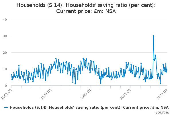Download this time seriesHouseholds (S.14): Households' saving ratio (per cent): Current price: £m: NSA