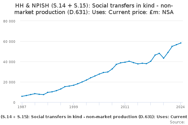 Download this time seriesHH & NPISH (S.14 + S.15): Social transfers in kind - non-market production (D.631): Uses: Current price: £m: NSA