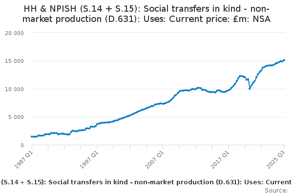 Download this time seriesHH & NPISH (S.14 + S.15): Social transfers in kind - non-market production (D.631): Uses: Current price: £m: NSA