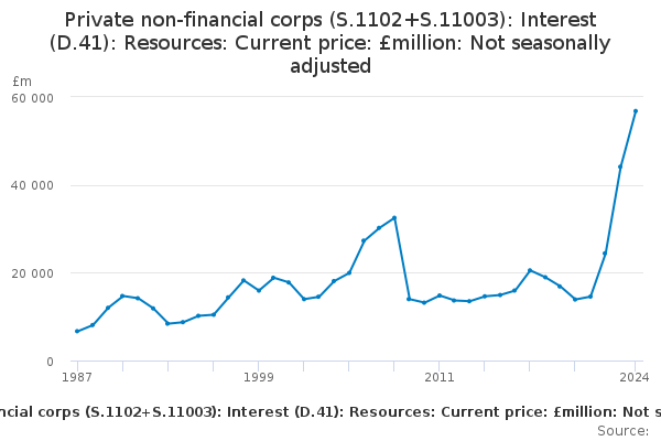 Download this time seriesPrivate non-financial corps (S.1102+S.11003): Interest (D.41): Resources: Current price: £million: Not seasonally adjusted