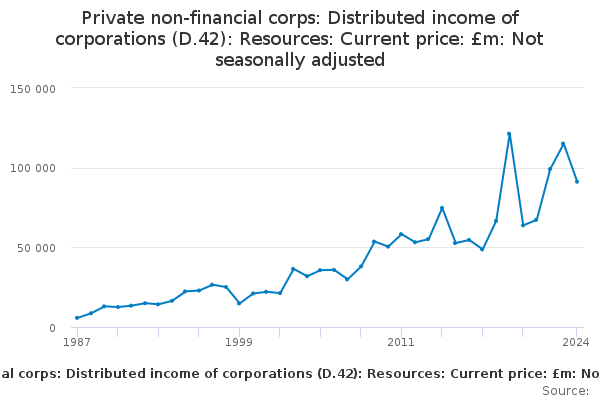 Download this time seriesPrivate non-financial corps: Distributed income of corporations (D.42): Resources: Current price: £m: Not seasonally adjusted