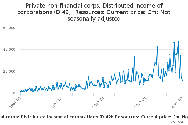 Download this time seriesPrivate non-financial corps: Distributed income of corporations (D.42): Resources: Current price: £m: Not seasonally adjusted