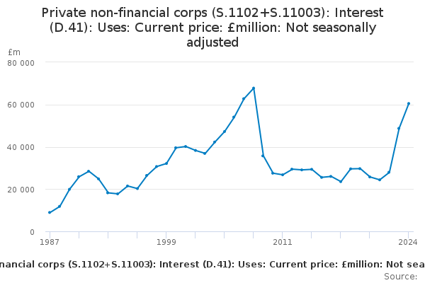 Download this time seriesPrivate non-financial corps (S.1102+S.11003): Interest (D.41): Uses: Current price: £million: Not seasonally adjusted
