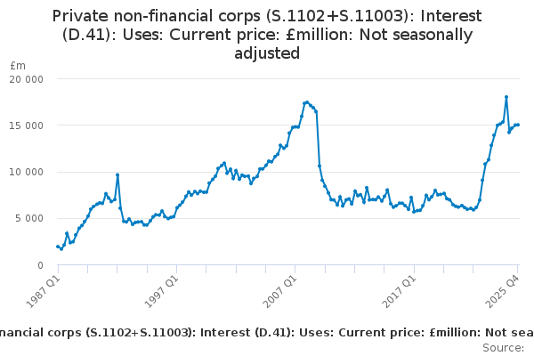 Download this time seriesPrivate non-financial corps (S.1102+S.11003): Interest (D.41): Uses: Current price: £million: Not seasonally adjusted