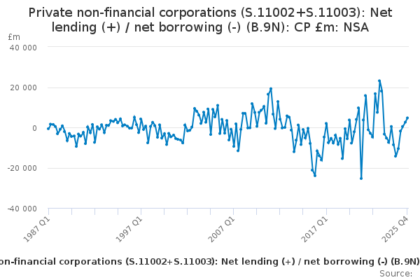 Download this time seriesPrivate non-financial corporations (S.11002+S.11003): Net lending (+) / net borrowing (-) (B.9N): CP £m: NSA