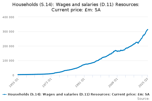 Download this time seriesHouseholds (S.14): Wages and salaries (D.11) Resources: Current price: £m: SA
