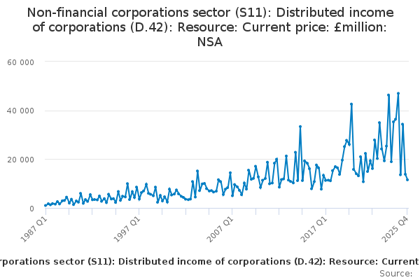 Download this time seriesNon-financial corporations sector (S11): Distributed income of corporations (D.42): Resource: Current price: £million: NSA