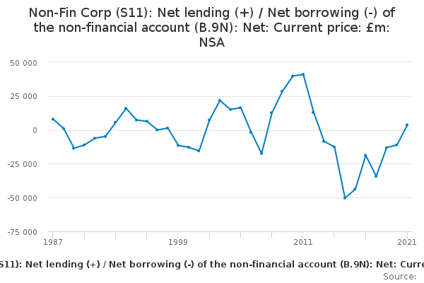 Download this time seriesNon-Fin Corp (S11): Net lending (+) / Net borrowing (-) of the non-financial account (B.9N): Net: Current price: £m: NSA