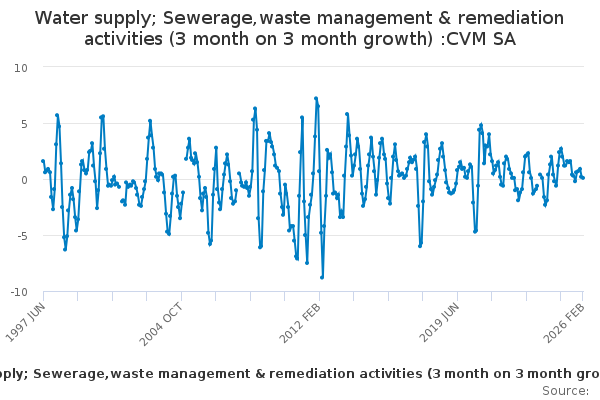 Download this time seriesWater supply; Sewerage,waste management & remediation activities (3 month on 3 month growth) :CVM SA