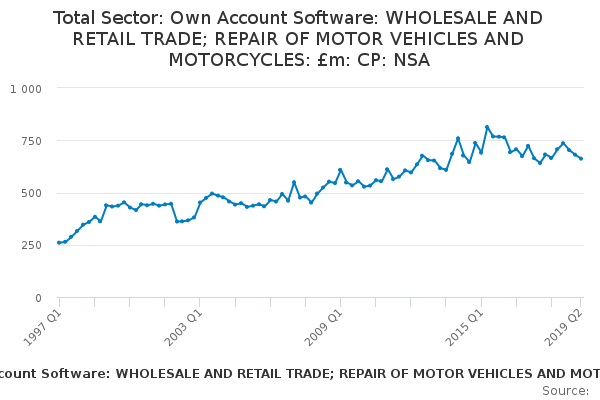 Download this time seriesTotal Sector: Own Account Software: WHOLESALE AND RETAIL TRADE; REPAIR OF MOTOR VEHICLES AND MOTORCYCLES: £m: CP: NSA