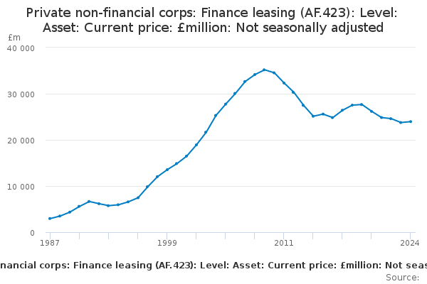 Download this time seriesPrivate non-financial corps: Finance leasing (AF.423): Level: Asset: Current price: £million: Not seasonally adjusted