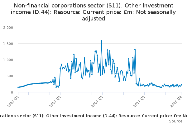 Download this time seriesNon-financial corporations sector (S11): Other investment income (D.44): Resource: Current price: £m: Not seasonally adjusted