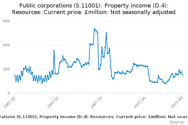 Download this time seriesPublic corporations (S.11001): Property income (D.4): Resources: Current price: £million: Not seasonally adjusted
