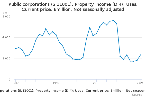 Download this time seriesPublic corporations (S.11001): Property income (D.4): Uses: Current price: £million: Not seasonally adjusted