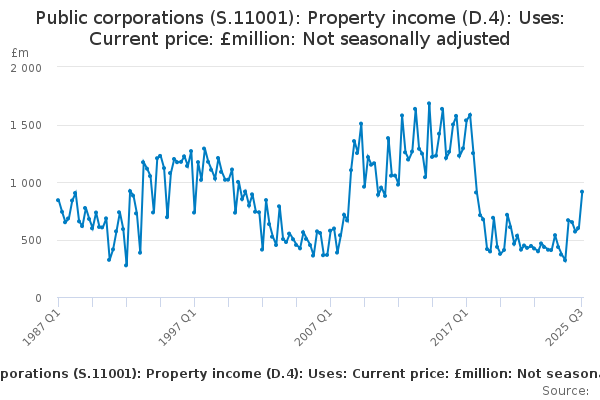 Download this time seriesPublic corporations (S.11001): Property income (D.4): Uses: Current price: £million: Not seasonally adjusted