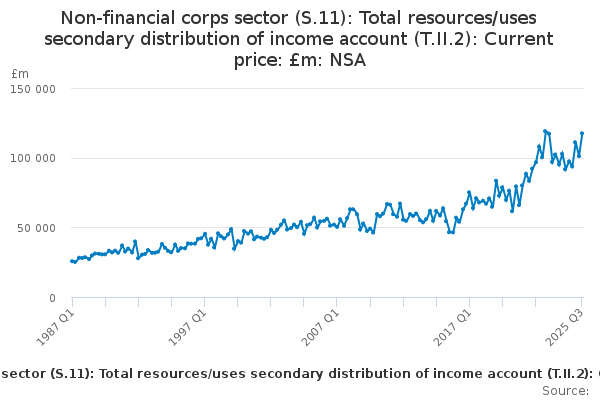 Download this time seriesNon-financial corps sector (S.11): Total resources/uses secondary distribution of income account (T.II.2): Current price: £m: NSA
