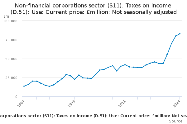 Download this time seriesNon-financial corporations sector (S11): Taxes on income (D.51): Use: Current price: £million: Not seasonally adjusted