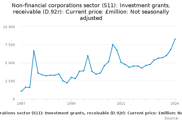 Download this time seriesNon-financial corporations sector (S11): Investment grants, receivable (D.92r): Current price: £million: Not seasonally adjusted