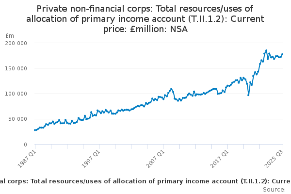 Download this time seriesPrivate non-financial corps: Total resources/uses of allocation of primary income account (T.II.1.2): Current price: £million: NSA