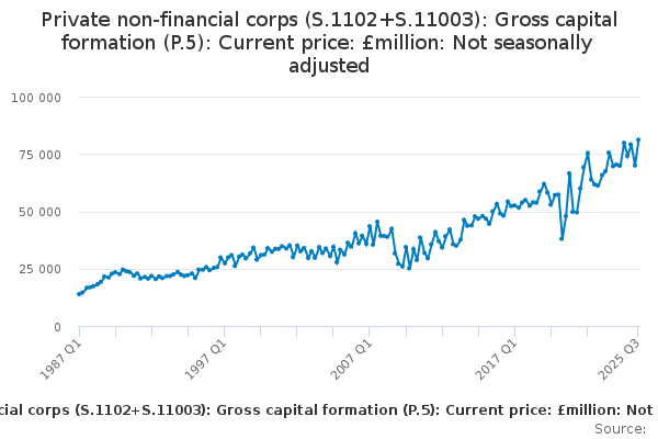 Download this time seriesPrivate non-financial corps (S.1102+S.11003): Gross capital formation (P.5): Current price: £million: Not seasonally adjusted