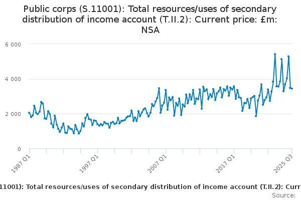 Download this time seriesPublic corps (S.11001): Total resources/uses of secondary distribution of income account (T.II.2): Current price: £m: NSA