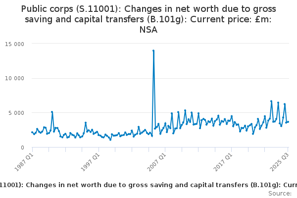 Download this time seriesPublic corps (S.11001): Changes in net worth due to gross saving and capital transfers (B.101g): Current price: £m: NSA