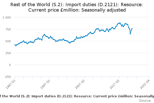 Download this time seriesRest of the World (S.2): Import duties (D.2121): Resource: Current price £million: Seasonally adjusted