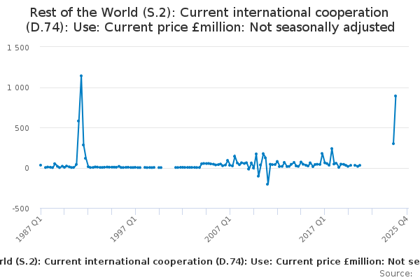 Download this time seriesRest of the World (S.2): Current international cooperation (D.74): Use: Current price £million: Not seasonally adjusted