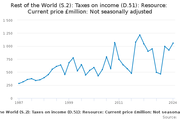 Download this time seriesRest of the World (S.2): Taxes on income (D.51): Resource: Current price £million: Not seasonally adjusted