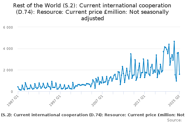 Download this time seriesRest of the World (S.2): Current international cooperation (D.74): Resource: Current price £million: Not seasonally adjusted