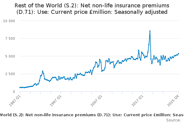 Download this time seriesRest of the World (S.2): Net non-life insurance premiums (D.71): Use: Current price £million: Seasonally adjusted