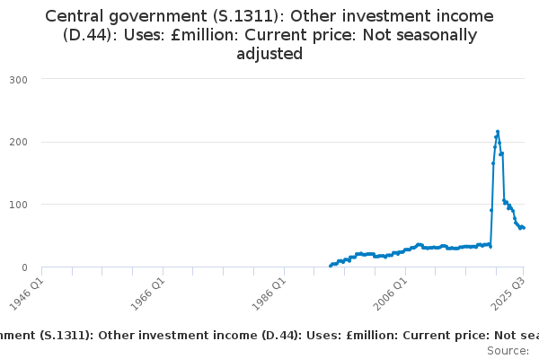 Download this time seriesCentral government (S.1311): Other investment income (D.44): Uses: £million: Current price: Not seasonally adjusted