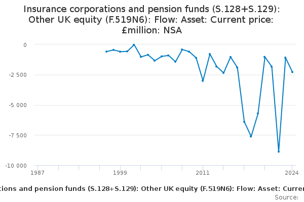 Download this time seriesInsurance corporations and pension funds (S.128+S.129): Other UK equity (F.519N6): Flow: Asset: Current price: £million: NSA