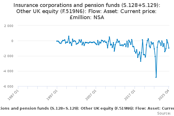 Download this time seriesInsurance corporations and pension funds (S.128+S.129): Other UK equity (F.519N6): Flow: Asset: Current price: £million: NSA