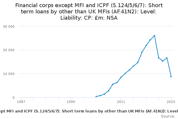 Download this time seriesFinancial corps except MFI and ICPF (S.124/5/6/7): Short term loans by other than UK MFIs (AF.41N2): Level: Liability: CP: £m: NSA