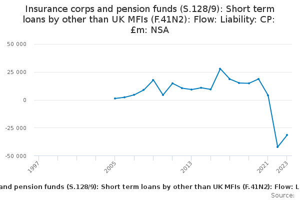 Download this time seriesInsurance corps and pension funds (S.128/9): Short term loans by other than UK MFIs (F.41N2): Flow: Liability: CP: £m: NSA