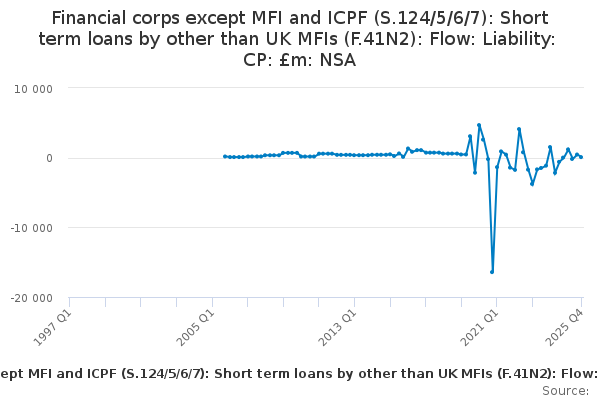 Download this time seriesFinancial corps except MFI and ICPF (S.124/5/6/7): Short term loans by other than UK MFIs (F.41N2): Flow: Liability: CP: £m: NSA