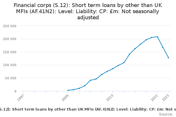 Download this time seriesFinancial corps (S.12): Short term loans by other than UK MFIs (AF.41N2): Level: Liability: CP: £m: Not seasonally adjusted