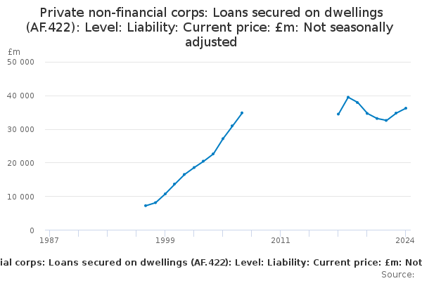 Download this time seriesPrivate non-financial corps: Loans secured on dwellings (AF.422): Level: Liability: Current price: £m: Not seasonally adjusted